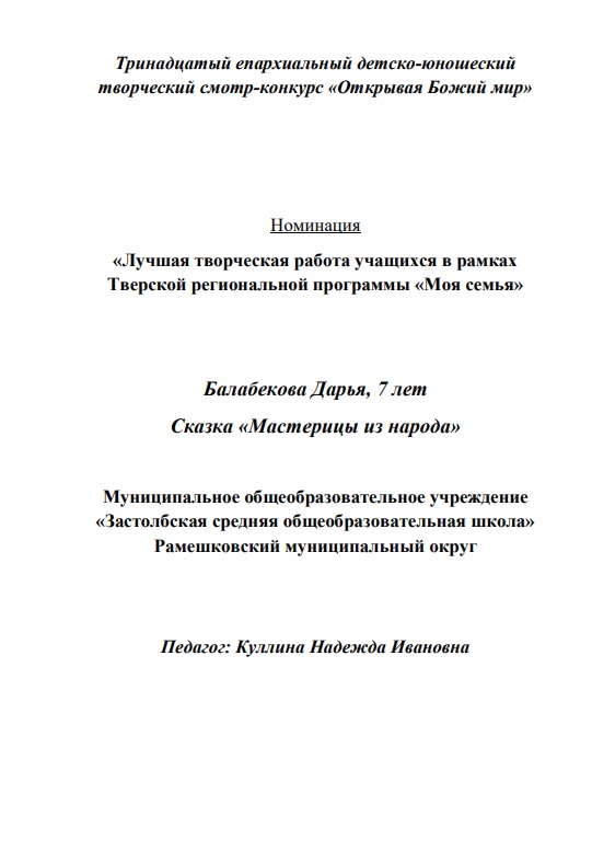 Балабекова ДарьяСказка «Мастерицы из народа»