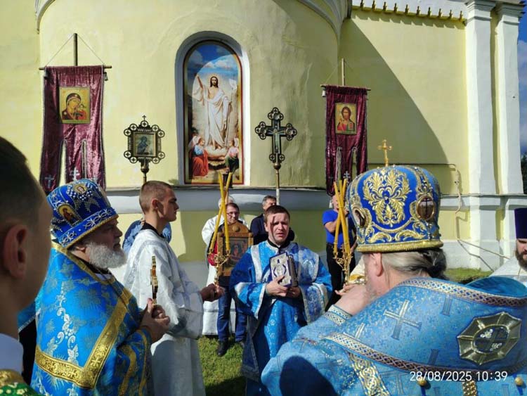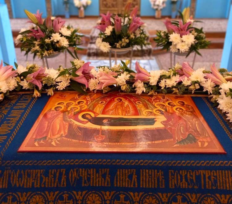По окончании Литургии вокруг храма прошел крестный ход. Затем перед иконой праздника было совершено славление и вознесена молитва Пресвятой Богородице.
