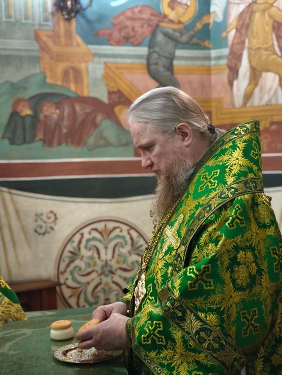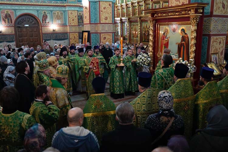 Совершение Божественной литургии возглавил митрополит Вологодский и Кирилловский Савва. Его Высокопреосвященству сослужили: архиепископ Бежецкий и Удомельский Каллистрат, епископ Великоустюжский и Тотемский Фотий, епископ Североморский и Умбский Тарасий, епископ Череповецкий и Белозерский Игнатий; секретарь Череповецкой епархии, почётный настоятель кафедрального собора города Череповца митрофорный протоиерей Александр Куликов; заведующий канцелярией епархиального управления, настоятель кафедрального собора преподобных Афанасия и Феодосия Череповецких иерей Сергий Бондарь; благочинный Устюженского округа, настоятель Казанского храма г.Устюжны протоиерей Константин Лобанов; настоятель храмового комплекса святителя Николая Чудотворца г.Череповца протоиерей Владимир Беляев; настоятель храма Рождества Христова г.Череповца протоиерей Сергий Сергеев; руководитель отдела по работе с молодёжью Череповецкой епархии, настоятель храма преподобного Сергия Радонежского г.Череповца иерей Роман Зайцев; духовник Череповецкой епархии, клирик храма Рождества Христова г.Череповца протоиерей Олег Кочубей; руководитель отдела по социальному служению и благотворительности Череповецкой епархии, ключарь Архиерейского подворья Воскресенского собора г.Череповца иеромонах Нил (Хоменец); руководитель отдела по работе с молодёжью Вологодской епархии иерей Михаил Максимов; насельник Спасо-Прилуцкого монастыря иеромонах Илларион (Свиридов); священнослужители Вологодской, Великоустюжской и Череповецкой епархий.