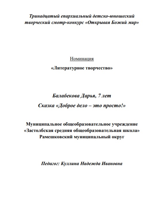 Балабекова Дарья Сказка «Доброе дело – это просто!»