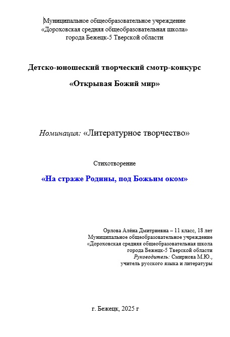 Орлова Алёна Стихотворение «На страже Родины, под Божьим оком»