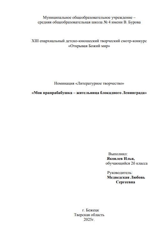 Яковлев Илья Сочинение «Моя прапрабабушка – жительница блокадного Ленинграда»