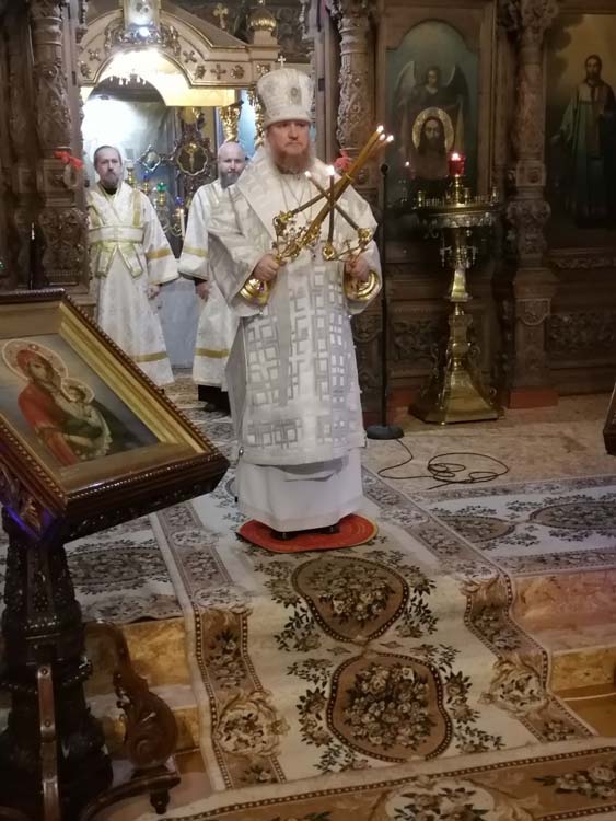 Накануне Архипастырь возглавил служение Всенощного бдения в Спасском кафедральном соборе г. Бежецка. Его Высокопреосвященству сослужили протоиерей Ярослав Шведов, протоиерей Евгений Новиков, иерей Алексий Брызгалов и диакон Сергий Валлит.