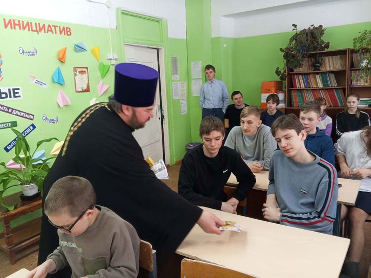 10 февраля в рамках соглашения о сотрудничестве Бежецкой епархии с Министерством образования Тверской области в учебных заведениях на канонической территории Бежецкой епархии, по благословению Высокопреосвященнейшего Каллистрата, архиепископа Бежецкого и Удомельского, благочинный Краснохолмского округа, настоятель Троицкого храма п. Молоково иерей Михаил Иванов провел беседы с учениками Молоковской СОШ им. Н.В.Огаркова и Ахматовской ООШ Молоковского муниципального округа о празднике Сретения Господня и о Дне православной молодежи, а так же о масленице и о Великом посте и его значении в жизни каждого человека.